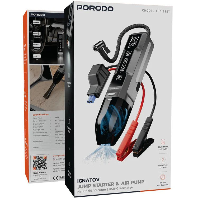 كن مستعدًا لأي طارئ على الطريق مع جهاز Porodo IGNATOV المتعدد الاستخدامات. يجمع هذا الجهاز القوي بين 4 وظائف أساسية في جهاز واحد صغير الحجم وسهل الحمل، ليكون أفضل أداة يمكن الاحتفاظ بها داخل سيارتك.