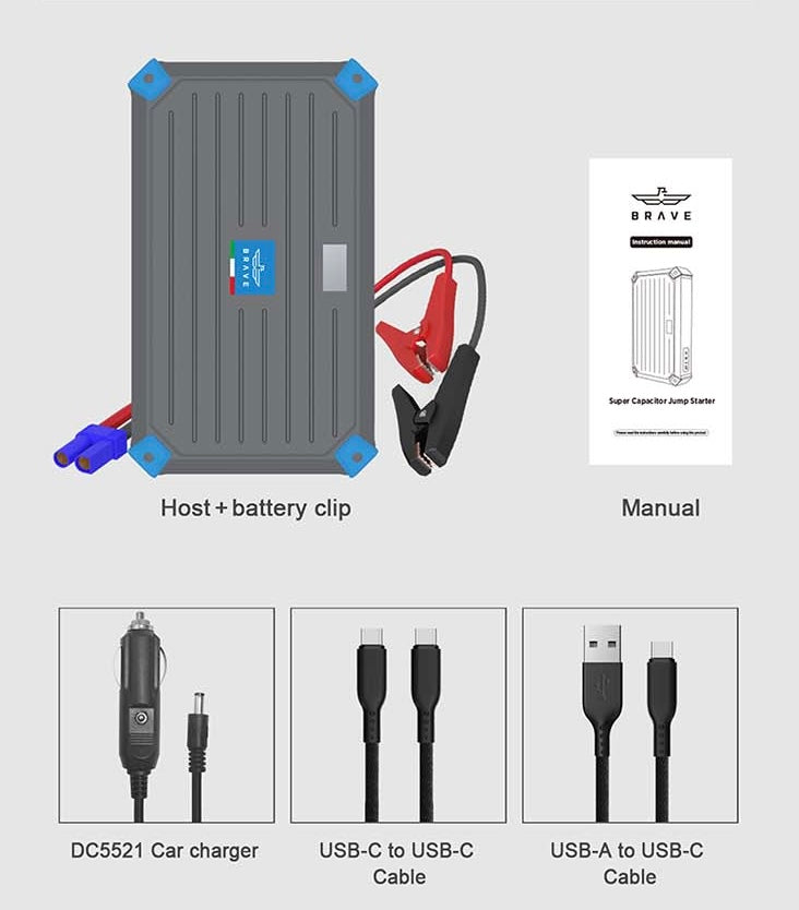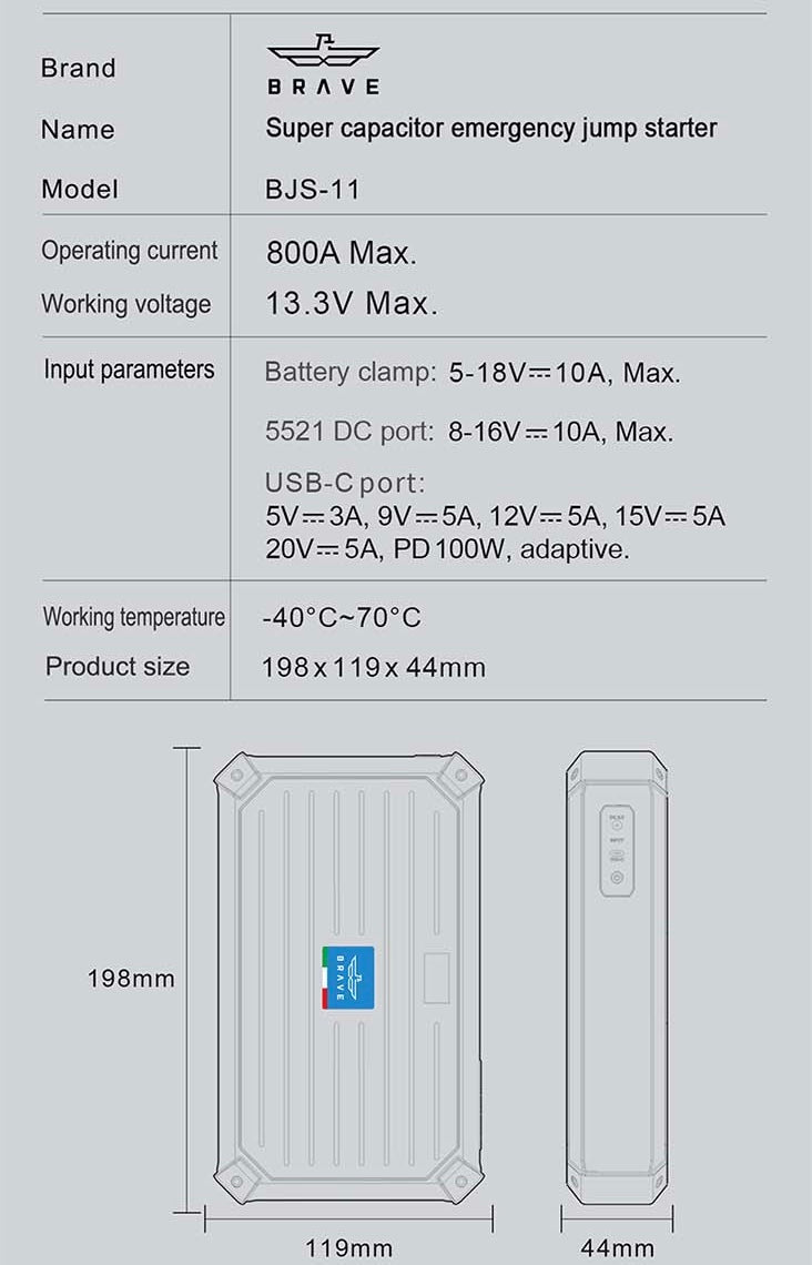 يتم شحن جهاز Brave BJS-11 عن طريق توصيله بمصدر طاقة خارجي لفترة زمنية قصيرة، ويتم تخزين الطاقة في الكاباكيتورات. وبمجرد أن يتم توصيل الجهاز ببطارية السيارة، يتم نقل الطاقة من الكاباكيتورات إلى بطارية السيارة لبدء تشغيلها.