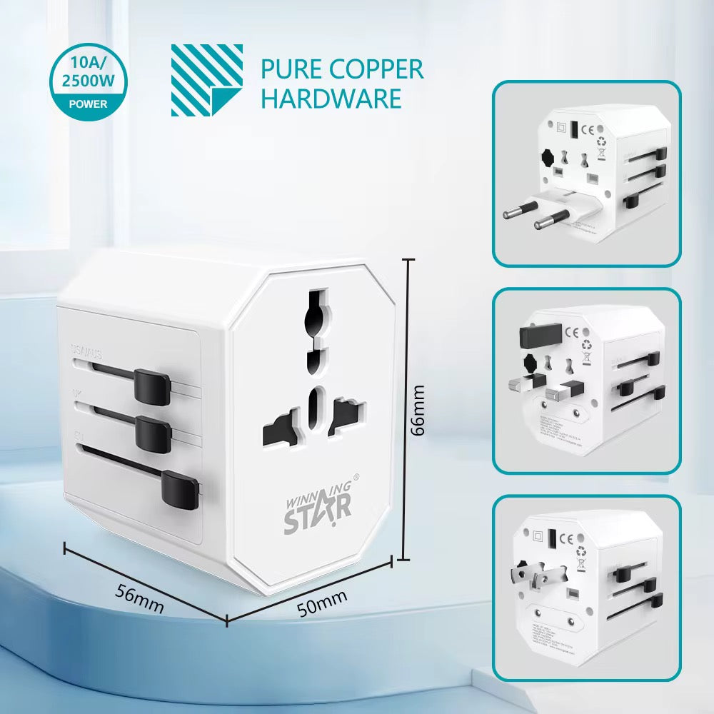 محول سفر عالمي متعدد المنافذ مع منافذ USB، تصميم مدمج وآمن من WINNING STAR