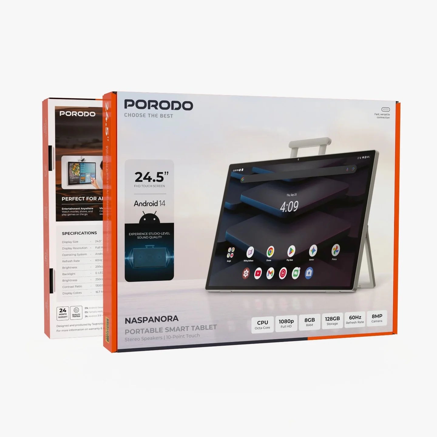 شاشة ذكية محمولة من Porodo Naspanora بحجم 24.5 بوصة تعمل بنظام Android 14، مصممة لتقديم تجربة ترفيه وعمل غامرة في أي مكان. شاشة لمس Full HD، أداء قوي، صوت ستيريو، وتصميم أنيق مع حامل قابل للتعديل يجعلها الخيار المثالي للاجتماعات، التعليم، الترفيه، والعرض التفاعلي.