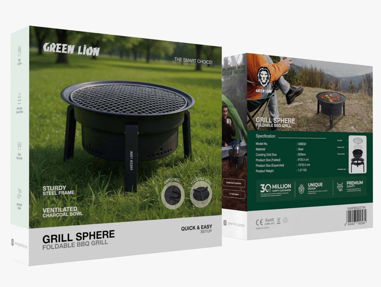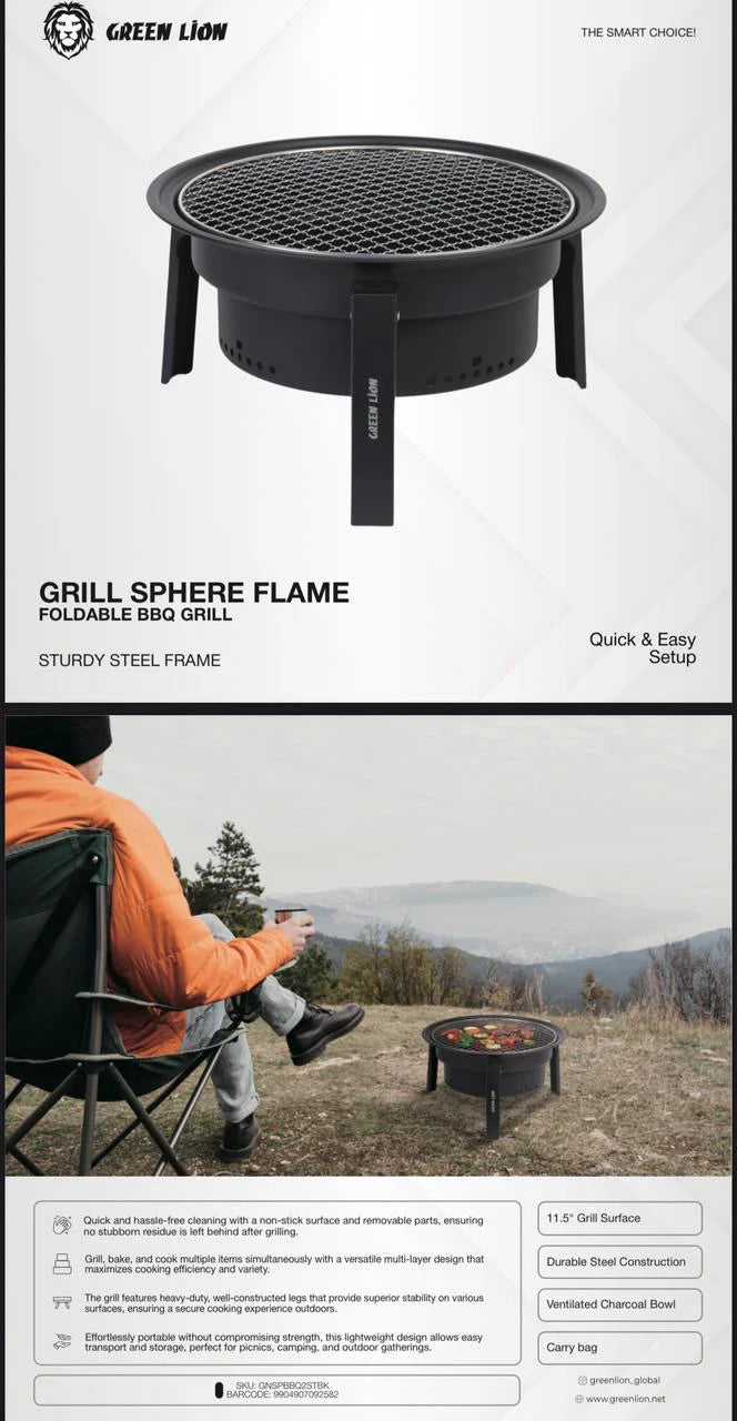 استمتع بأفضل تجربة شواء في رحلات التخييم والنزهات الخارجية مع شواية Green Lion Grill Sphere Flame القابلة للطي. تتميز بتصميم قوي من الفولاذ المقاوم للصدأ مع وعاء فحم مهوي يسمح بتوزيع الحرارة بشكل متساوٍ للحصول على أفضل نتيجة شواء.