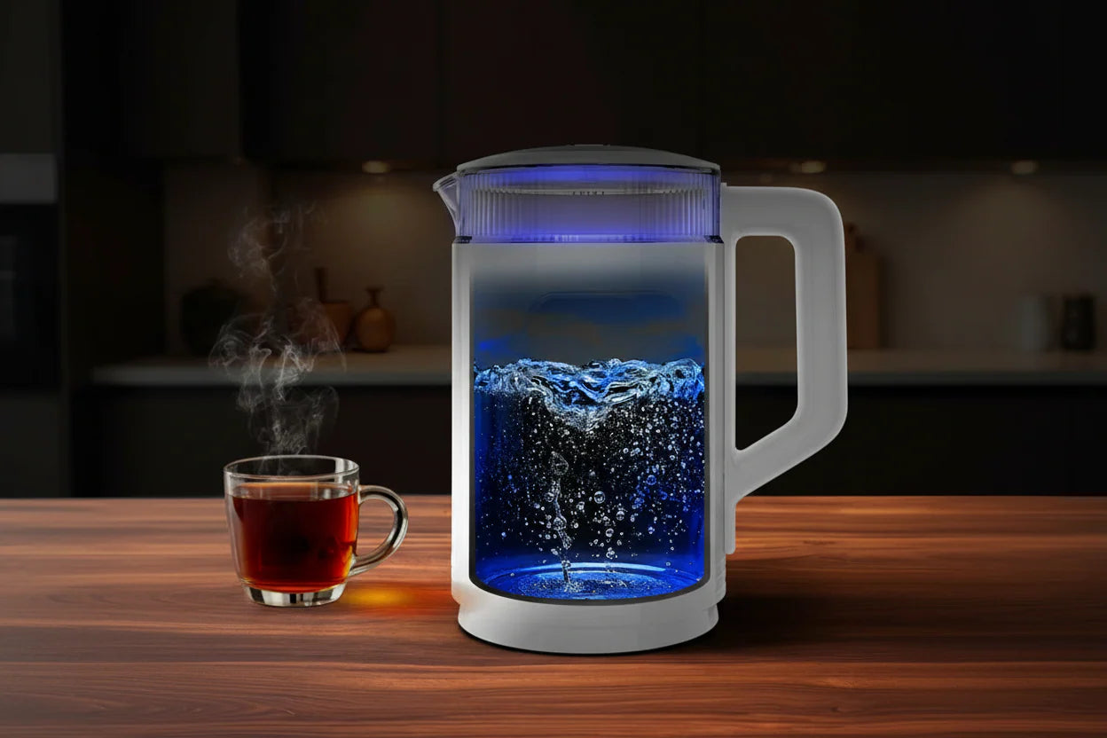 تم تصميم الغلاية بهيكل مزدوج الجدار: طبقة خارجية من بلاستيك غذائي آمن وصديق للبيئة، وطبقة داخلية من الزجاج عالي الجودة، ما يحافظ على برودة السطح الخارجي ويقلل الضجيج أثناء التسخين ويمنع الحروق.